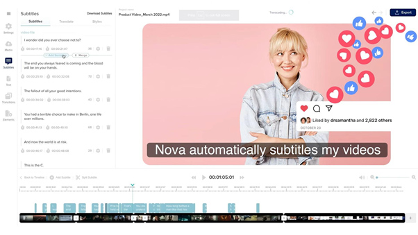 The video editor Nova A.I. has an AI-powered subtitle generator that uses natural language processing to transcribe subtitles for your videos. You can generate and edit each subtitle card word-by-word, style your subtitles the way you want, and translate them into more than 75 different languages. You can export your subtitles hardcoded onto your video or download them as a subtitle or text file (.SRT, .VTT, or .TXT). To add subtitles to YouTube videos with NOVA A.I. follow these few steps: