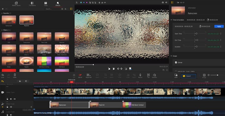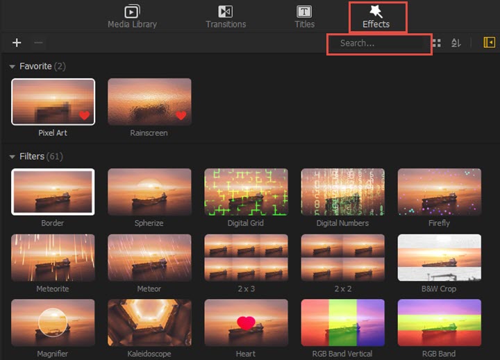 Step 2. Go to the Effect tab next to the media library at the top left, and input "Pixel Art" or "Rainscreen" in the search box, both of which could help to create the video blur effect and blur the video image.
