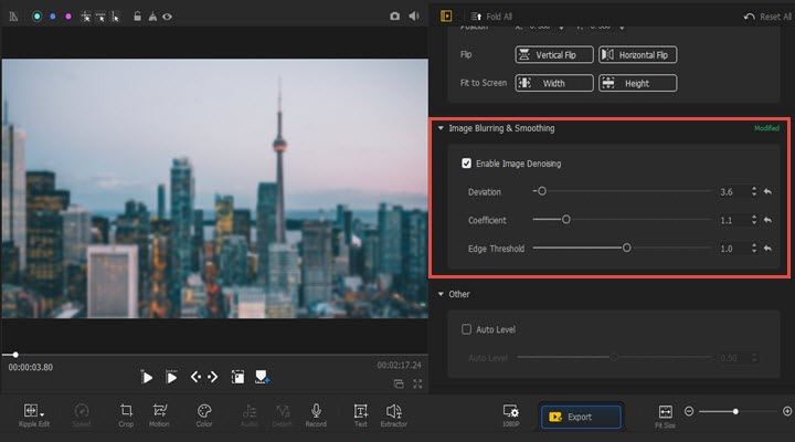Step 3. Go to the inspector panel, scroll down and find the Image Blurring & Smoothing, and check to enable it. Move the slider or manually change the Edge Threshold value to blur the image, and adjust Deviation and Coefficient to do some fine-tuning until you get what you want.