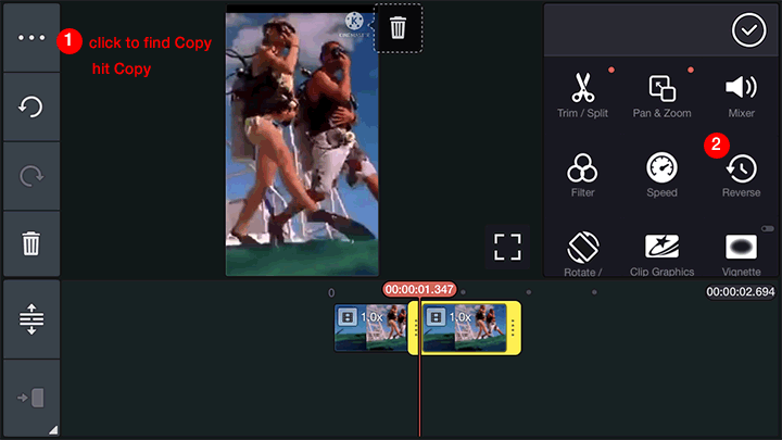 5. Click Copy and press Reverse. By doing this, you can make a boomerang out of a video. If necessary, repeat step 6 many times to make the boomerang video longer.