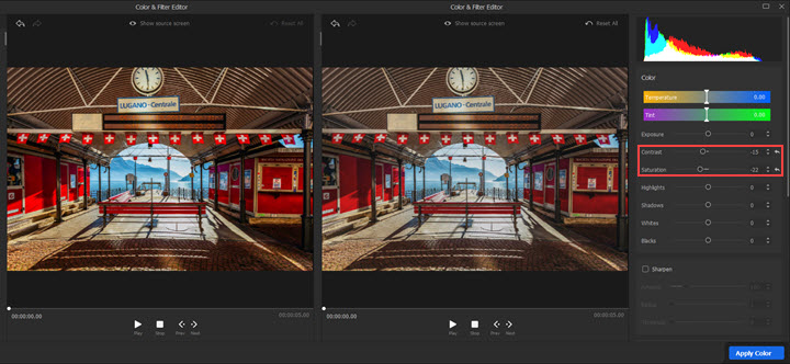 In the VideoProc Vlogger color editor, you can tweak values of contrast and saturation by simply moving the sliders in these two options.