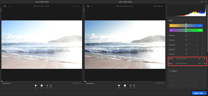 Whites control the general brightness but have a greater impact on the bright parts in your video. Blacks change the shadows of every area but have a greater impact on the dark parts. Compared to Highlights and Shadows, these two influence the overall. You can balance whites and blacks by dragging the sliders in these two options.