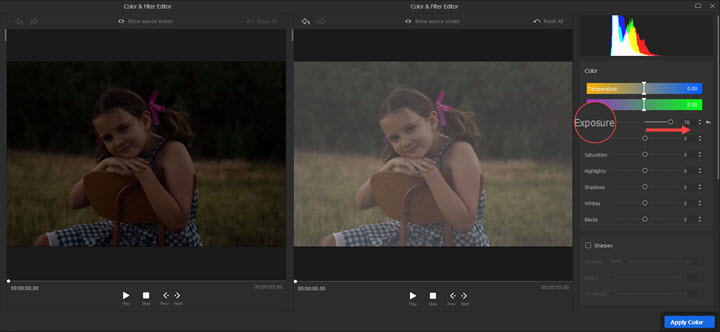 Note: Exposure adjusts the brightness of the whole footage. So if you want to keep proper-exposed parts original, you are recommended to adjust Highlights or Shadows first.