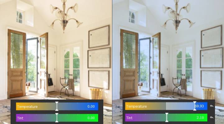 In VideoProc Vlogger, you can adjust the white balance by setting the Temperature and Tint. Drag the Temperature slider left to add yellow to your whites and right to add blue. Drag the Tint slider left to switch the whites towards magenta and right to switch them towards green.