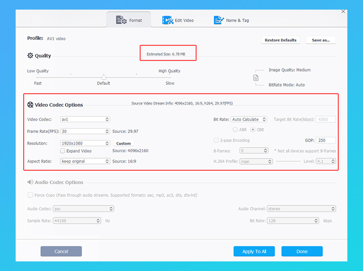 To do so: Click the gear icon next to the format for detailed settings (codec parameters, bitrate, sample rate, etc.) to balance quality and size. Use the estimated size near the "Quality" option as a guide.