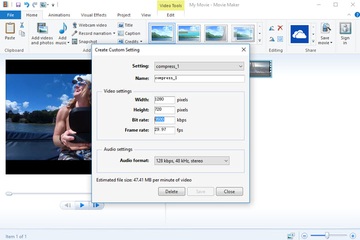 Step 5. Click Save movie again and choose the settings just created. Then export the MP4 from Windows Movie Maker.
