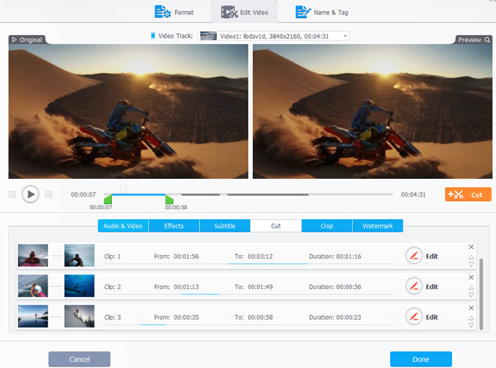 In VideoProc Converter AI, you can trim the beginning/end part, cut at any position in the video, or split it into several equal clips.