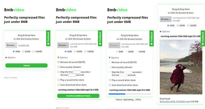 Downloading a compressing app on your Android phone is a good option to compress a video for email. Besides that, you can also use an online video compressor to compress video online on your Android device for occasional uses. 8mbvideo is a video compressor for Discord. It is easy to use and compatible with various browsers. Although it doesn't let you dig into settings much further, you can choose a compressed video size among 8MB, 50MB, and 100MB.