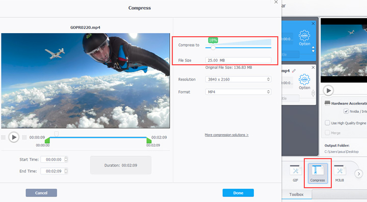 VideoProc Converter AI is a video compressor that can reduce video size by 90% while maintaining the best balance between size and quality. You can adjust the codec (to AV1, HEVC, and more), bitrate, resolution, CRF, duration, and frame rate per your needs. It's all up to you to decide the compressed video size, be it 8MB or 25MB.