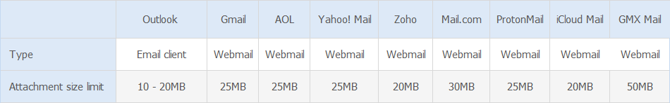 We've all experienced a situation where failing to attach video files to emails due to the overlarge file size. Most email services have limits on the file size of attachments. For Gmail, Yahoo Mail and AOL, the maximum size limit is 25MB; for Outlook and iCloud Mail, that would be 20MB. You'll receive an error message if you attempt to attach files larger than that.