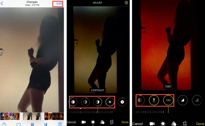 The photos app on iPhone allows you to directly edit the videos. By adjusting some parameters, you can change the color of the video into red light, and other shades of colors if you like.