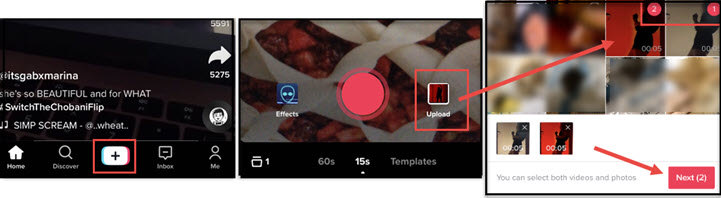 - Tap the + icon to post a video, and tap upload to tick the two clips from the camera roll/photo gallery folder.
