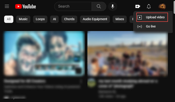 Go to your YouTube channel on a web browser on your computer. Click the upload icon in the top right corner. Then select a file on your computer to upload.