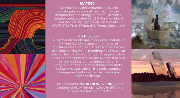 Below is a glimpse of a Music Video Treatment by Dano Cemy, the director of the music video No New Friends by LSD ft. Labrinth, Sia, Diplo.