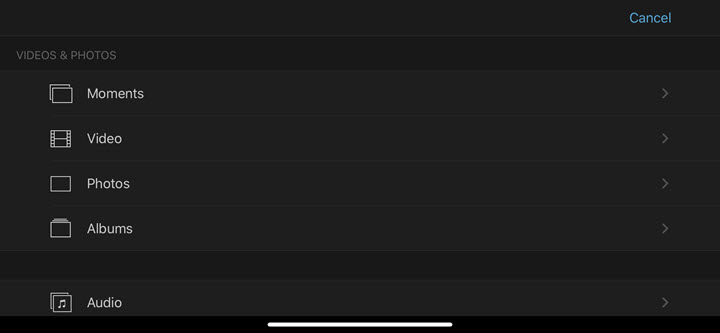 Hit the plus icon beside the preview windows. You can load either a video or a photo from Moments, Video, Photos, and Albums. Repeat this step to add as much media content as you wish. If you've added an unwanted clip, just swipe it up to remove it.