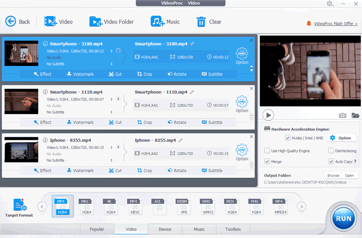 Another way to make a short video longer is to add more clips. Check your computer, smartphone, and external hard drive to find some footage that could fit to this video. Alternatively, you can download some videos, intros, and outros without copyright. And then merge them into one video with VideoProc Vlogger.