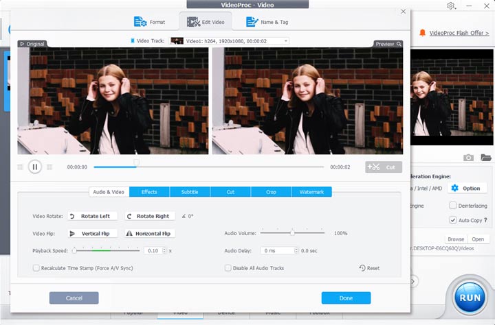 In VideoProc, the speed of a video can be reduced to 1/32x to the utmost. But taking into account the video final video quality, we recommend slowing down the video by 1/2x, and you can get a video twice longer than the original. Here's how.