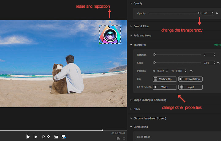 Double-click the watermark clip on the preview window to adjust the location and size. Drag the ends of the watermark clip on the timeline to change its duration.