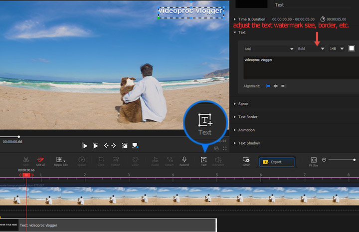 • To add some texts as the watermark, hit Text on the toolbar, and then go to the inspector panel on the right to customize the opacity, content, size, animation, border color, and plenty of other properties. Drag the ends of the text clip on the timeline to change its duration.