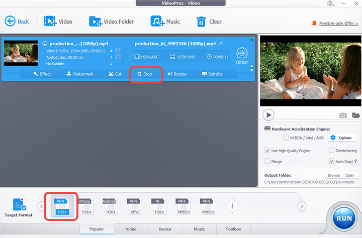 Why we suggest choose MP4 H.264? It's highly compatible. Outputting H.264 can trigger level-3 GPU acceleration tech which lets you convert horizontal videos to vertical in seconds with minimum CPU usage.