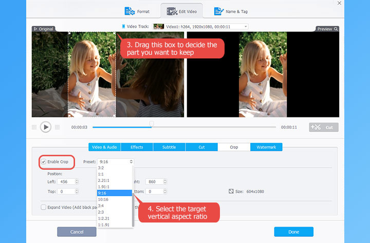 Choose the Enable Crop option. Unfold the Preset menu and select 9:16, 3:4, or other vertical aspect ratios you need. After that, drag and move the cropping box on the left project window to decide the parts you want to keep. Press Done.