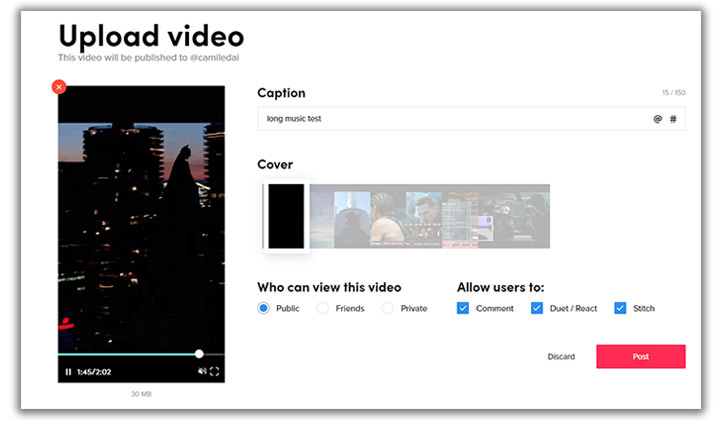 Step 6. Now, you post the video that was automatically converted and downloaded through the online tool. It usually takes around 10 minutes for TikTok to upload and process the video with music longer than 60 seconds. You can enter the video caption, apply the privacy settings, and other information during the processing.