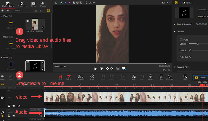 Step 2. Drag and drop the video and audio clips that you want to merge as one TikTok video from the computer to Media Library. After that, drag the video clip onto the video track and drag the audio clip onto the audio track.