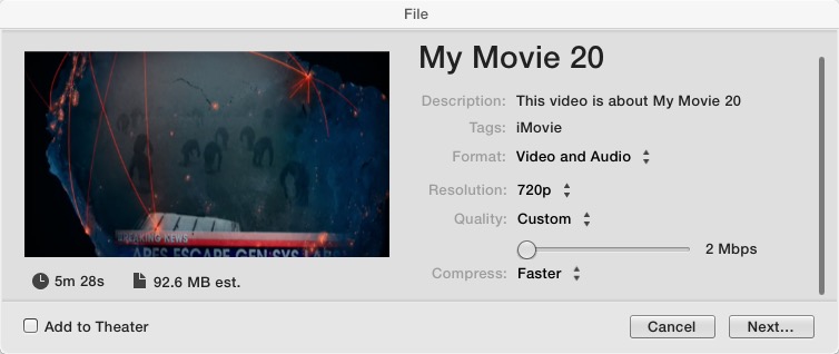 Step 3. In the exporting setting, there are 3 options which we can deal with for making the video file smaller. They are Resolution, Quality, and Compress. Here we still export the original video in 720P, even though iMovie also provides you with 540P (the other two options are 1080P and 4K). Quality offers Low, Medium, High, Best, and Custom. It actually is about bitrate. We chose Custom and set it to 2 Mbps, the lowest one. This improves the original bitrate from 1200kbps. Obviously, this is not what we want. However, iMovie does not provide bitrate number lower than 2 Mbps. We can do nothing about it. Then the Compress feature is set to Fast (the other one is Better Quality).