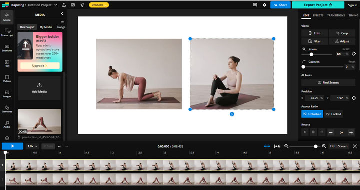 Kapwing is an online video editor that is great for quickly creating short side-by-side videos for sharing on platforms like Instagram, YouTube, and TikTok. It allows you to easily add multiple video clips and position them in various ways such as side by side or on top of each other. Additionally, Kapwing provides access to stock videos, photos, and background music. However, it's important to note that Kapwing doesn't come with fancy features like motion chroma keying, motion tracking, and variable speed changes. Its free version comes with limitations, such as a watermark on the output, a maximum video length of 7 minutes, and a resolution cap of 720p.