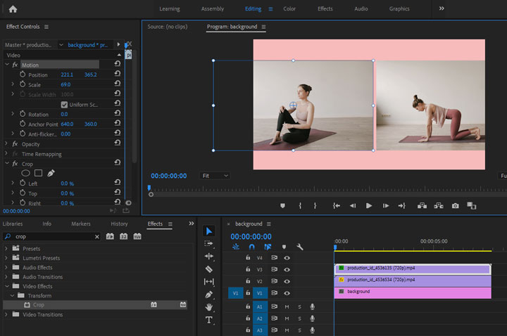 Step 7. You can use the Motion effect controls to resize and reposition the clips as needed. Fine-tune the alignment and positioning of the videos until you are satisfied with the side-by-side arrangement. Suppose you want to chop off unwanted pixels, go to the Effect panel, search for the Crop option, drag that onto the video clip on the timeline, and then you can drag the cropping box to remove off unwanted pixels.