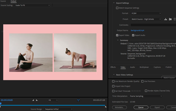 Step 8. Preview the video to ensure that the two clips are displaying side by side correctly. Once you are happy with the layout, press Ctrl and M and then finish the export settings to export the side-by-side video to your computer.