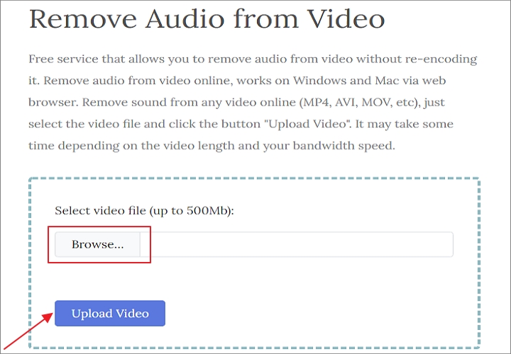 What if you want to remove sound from MP4 without downloading or installing software? At this time, an online audio remover like AudioRemover can help you out. It works on Windows and Mac computer via web browsers. In addition, you can also remove audio from video in AVI, MOV, and other formats. You just need to click the Browse button to select the MP4 file, and then click Upload Video to start removing audio from MP4 video. After removing, you can download the file. It lets you remove audio from MP4 that up to 500MB. If your MP4 file is over 500MB, try method 1.