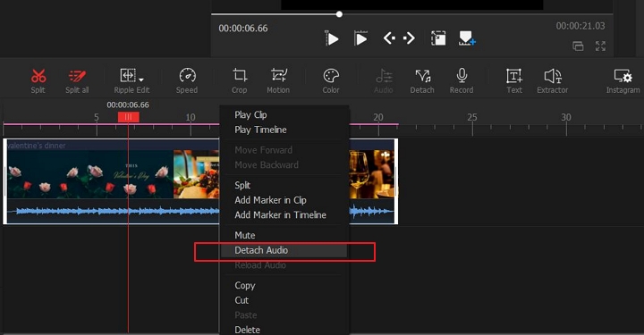 Step 1. Drag and drop your MP4 file to the Video Track. Select the MP4 file on the timeline and right click to choose Detach Audio.