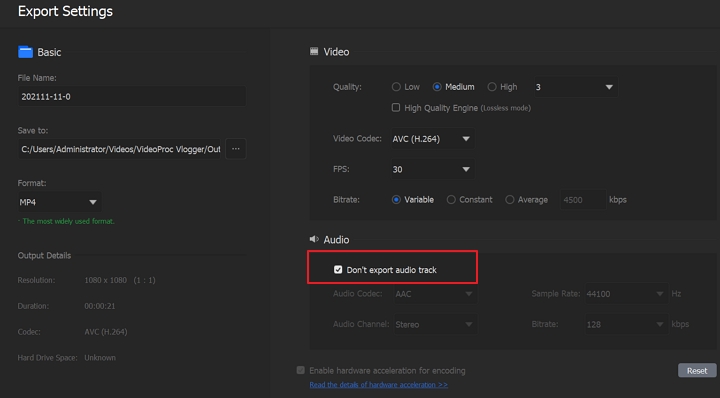 After uploading MP4 to VideoProc Vlogger, drag and drop it to the Video Track. Click Export icon and check "Don't export audio track." to remove audio from MP4.