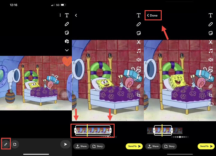 Step 2. Click on the pencil icon in the lower left to enable the editing mode. You can then use the trimming tool to trim your snap video by dragging the slider left and right.