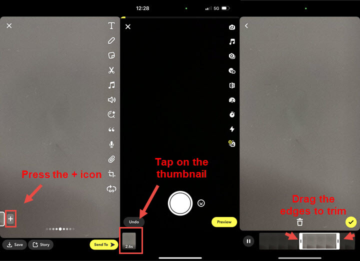Step 3. Drag the left and right edges to trim the snap video. Once finished, click on Done. Snapchat allows a maximum video length of 60 seconds, and you can add more recordings by using the + icon and merge them into a new video.