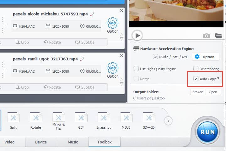 Step 3. Click on Done, enable the Auto Copy feature to ensure 1:1 video and audio quality without re-encoding, and hit Run to export your trimmed snap videos.