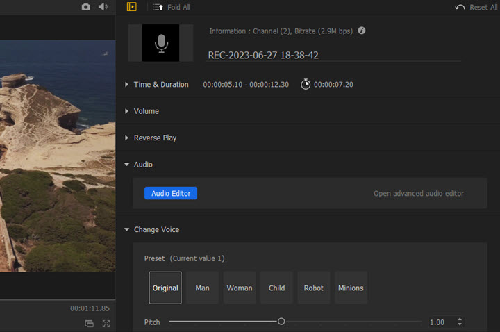 Your narration will be saved in the Media Library automatically. Drag and drop it to the Audio Track in the timeline. Now you can move to adjust its position, split, delete, adjust volume, change voice pitch, and apply more edits to the voice-over.