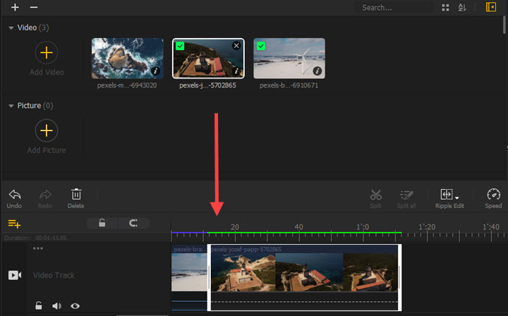 Drag and drop your video file to its media bin in the top left section. Then drag and drop it to the Main Track in the timeline.