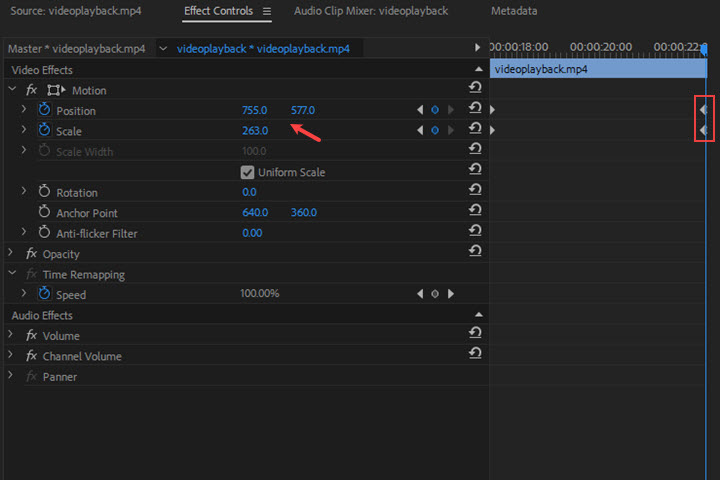 Step 4. Then drag the playhead to the end of the clip in Effect controls. Now drag the cursor on the box video position and scale parameters to adjust the zooming position and scale. And the zoom in/out effect can be previewed in real-time on the right window.