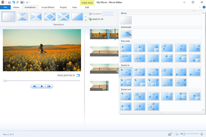 Note: Pan and zoom effects cannot be used at the same time in Windows Movie Maker. And the zoom speed cannot be customized.