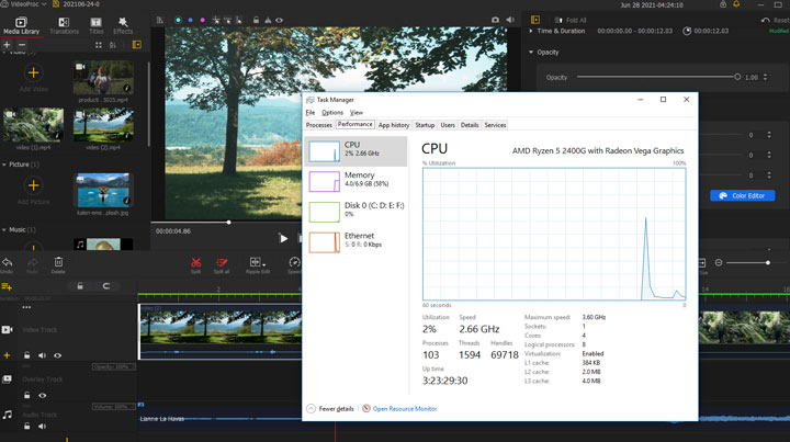 I import three pieces of 4K video clips, one JPG picture, and an MP3 music clip to the program, and then adjust the video playback speed, remove some unnecessary frames, add color correction filters, and adjust the music length. The picture below is the CPU usage information and time when I opened VideoProc Vlogger.