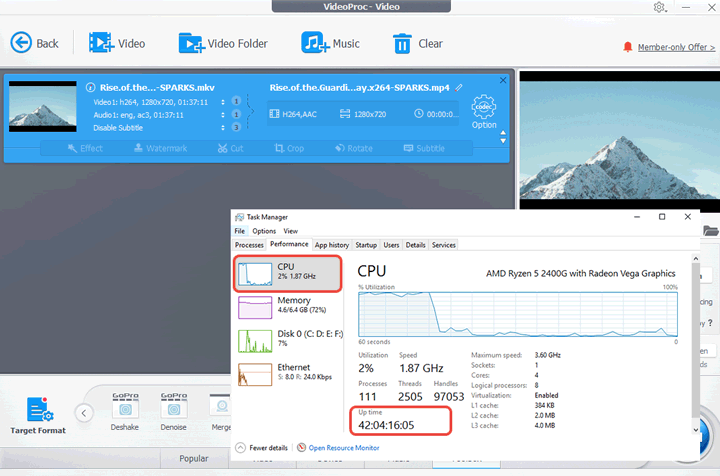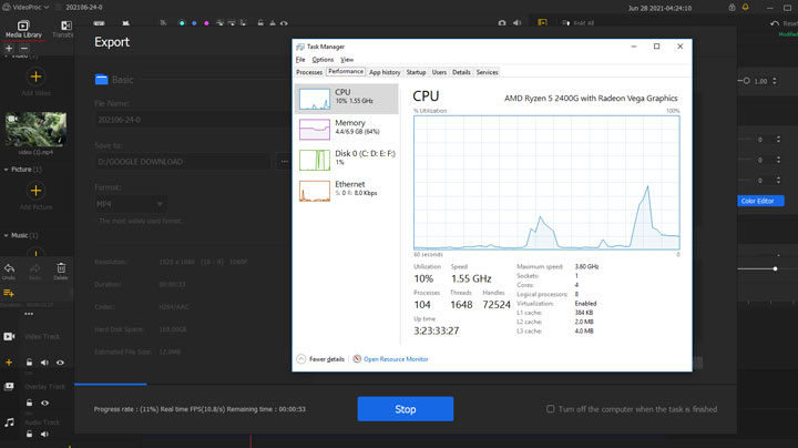 It is shown that the CPU usage rate was only around 10%, and it took less than 3 minutes for VideoProc Vlogger to get the job done.