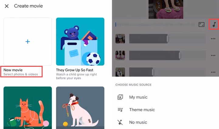 Step 4. Now you get to the editing tab. Tap the music icon to choose the music source. You can use your own soundtrack uploaded to Google Photos in the "My music" option, or use preset background music in the "Theme music" option.