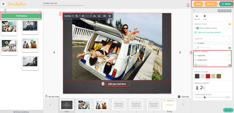 The text can be added by clicking on the textbox. Click on Choose music option and select the required music file.
