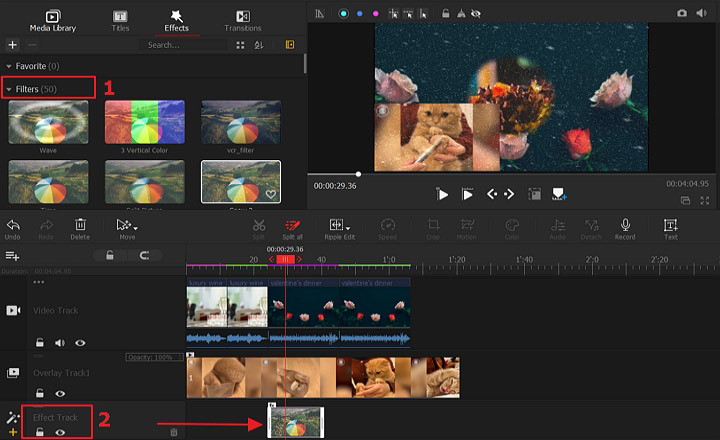 Adding filters to video will make your videos more attractive. Find Filters under the Effects tab, select a filter you like and drag it to the Effects Track.