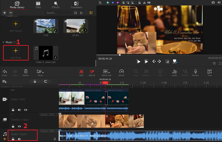 Click Add Music to upload your background music here. Drag and drop it to the Audio Track.