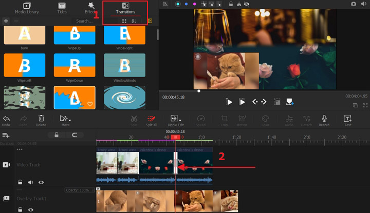 It's pretty cool to add some fancy transitions to your videos. Under the Transition tab, select and drag the transition effects you want to the Video Track and put it between two video clips.