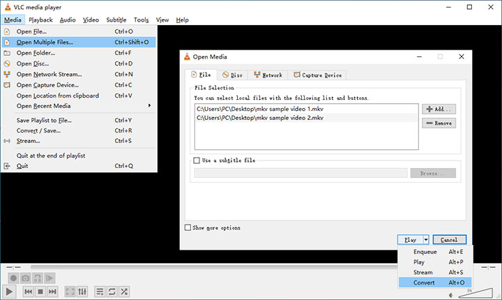Step 2. Go to Media > Open Multiple Files… > Add to import all of the MKV videos you want to combine.