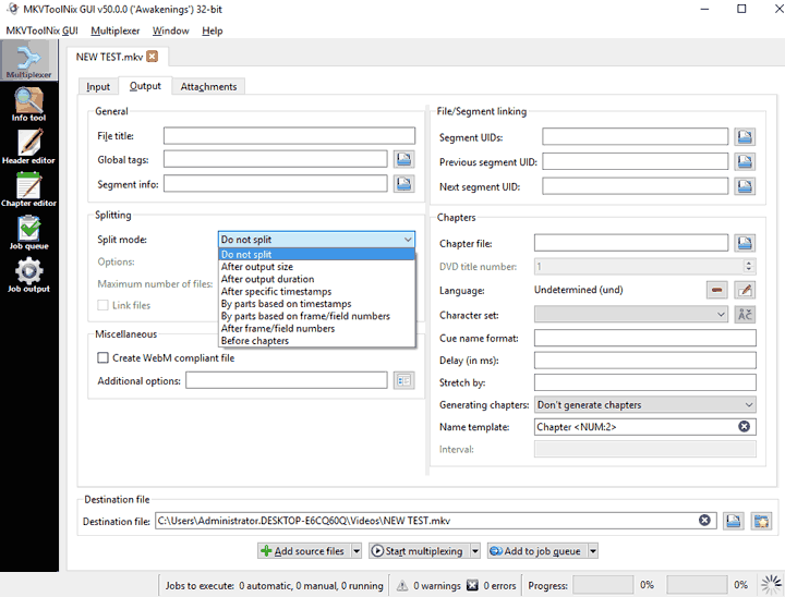 MKVToolnix is an open-source program that is specially designed for processing MKV files. Having 5 different split modes (After output size, After output duration, After specific timestamps, By parts based on timestamps, By parts based on frame/field numbers, After frame/field numbers, and Before chapters) is perhaps the best thing this MKV splitter freeware could give to you. With it, you can split TV show into single-episode files by chapters, and separate a big MKV file into a few smaller segments with social media friendly size, etc.